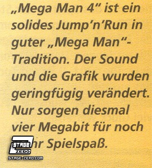 Nicht schlecht mit satten vier Megabit! Ich will ganz bestimmt nicht über technischen Eigenschaften alter Game Boy Spiele lästern. Aber mal ehrlich wer von den Lesern wußte eigentlich was 4 Megabit ausmachen? Ist das überhaupt brauchbar für ne Spielebewertung? Ich mein, die schreiben die 4 Mbit geben einen Spielspass Ruck. Ist das ein Grund sich das Spiel zu kaufen? Außerdem was zerren die 4 Megabit am Spielspass? Ist Mega Man 4 deswegen bunter oder abwechslungsreicher?
